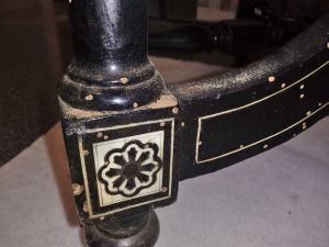 Mobiliario del despacho milanés del s.XIX, perteneciente a la colección del Museo Nacional de Cerámica ( Palacio Marqués de Dos Aguas de Valencia). Soporte tallado y torneado en madera de pino, lacado en negro imitando el ébano con incrustaciones de rica decoración de marquetería en hueso de motivos geométricos, ornamentos de grutescos, guirnaldas vegetales y personajes con indumentaria renacentista.