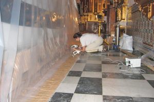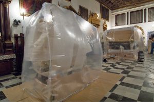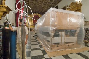 La Hermandad del Museo de Sevilla nos encarga erradicar el ataque biológico que afectaba a su “Paso del Cristo de la Espiración” . Mediante la aplicación del tratamiento de desinsectación mediante atmósferas transformadas con gases inertes se eliminan por anoxia todas las fases del ciclo biológico de los insectos existentes. Una burbuja de MUSEO