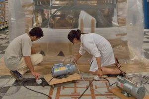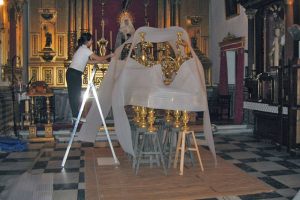 El tratamiento fue llevado a cabo in situ en la capilla de la Hermandad, donde fabricamos dos burbujas de desinsectación termoselladas, adaptando su diseño a las dimensiones del paso sin desmontar canastilla ni parihuela y otra burbuja con los cuatro candelabros dorados.