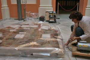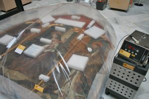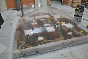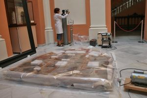 Para garantizar la erradicación del ataque de insectos xilófagos que afectaba al soporte de la pintura sobre tabla, llevamos a cabo in situ en la Casa Consistorial  su tratamiento de desinsectación mediante la técnica de atmósferas  transformadas con gases inertes. La obra permaneció sin oxígeno, durante 28 días dentro  de la burbuja de desinsectación con unas condiciones medio ambientales  de humedad relativa y temperatura idóneas y una concentración de oxígeno inferior al 0,044% .